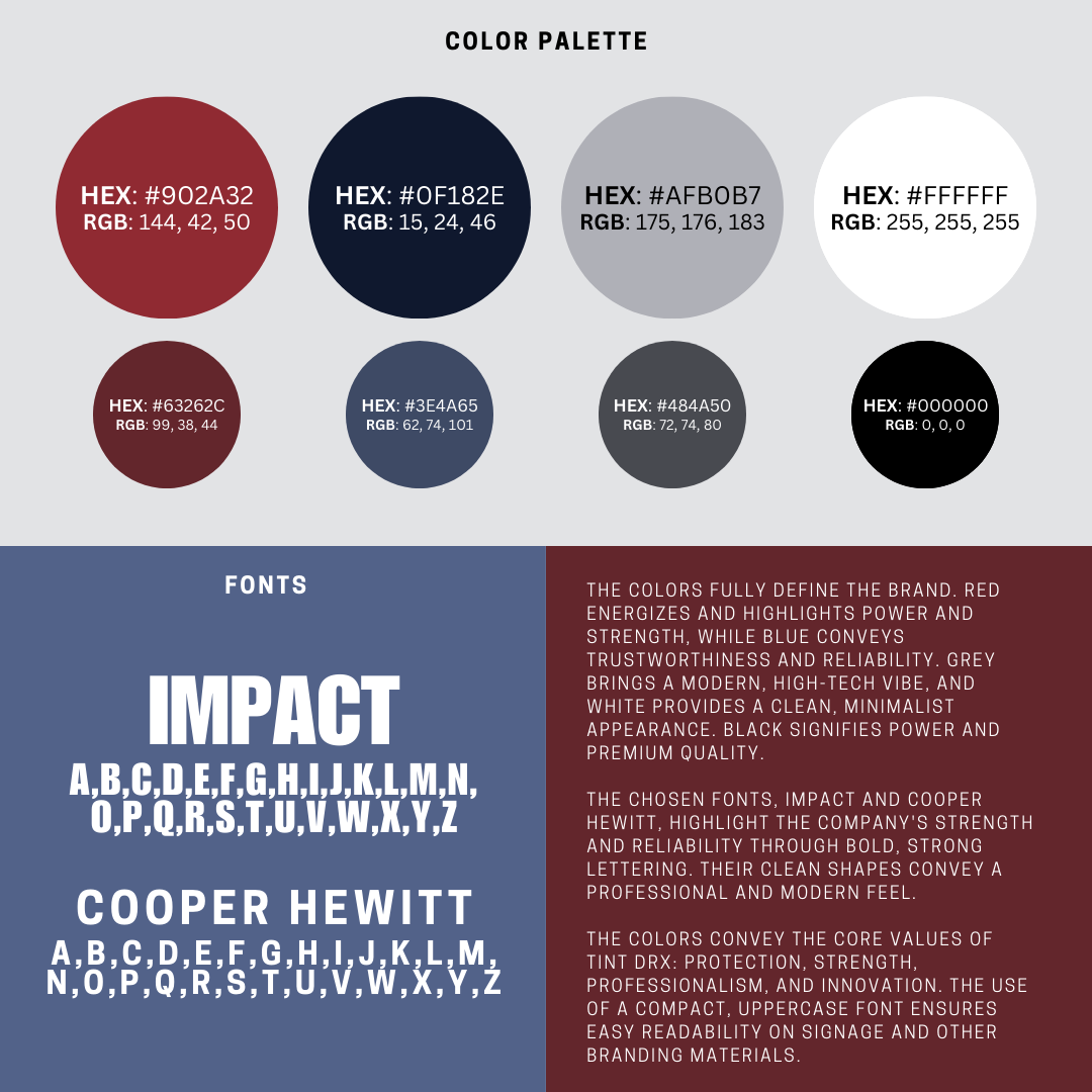 Tint DRX specializes in automotive, residential, and commercial tinting. I developed their brand identity and created supporting content to align with it. The shield symbolizes protection and durability, while the colors were selected by the company owner. Consistently using the chosen colors and the same car imagery ensures strong brand recognition.